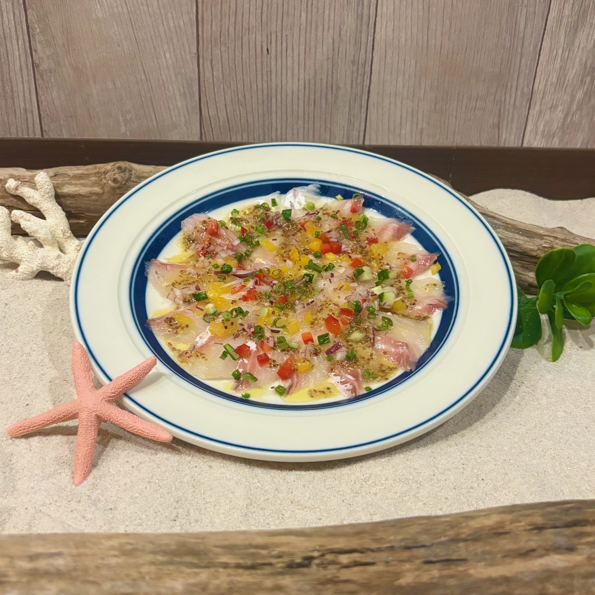 新鮮な真鯛を特製ビネガーソースでカルパッチョに🐟